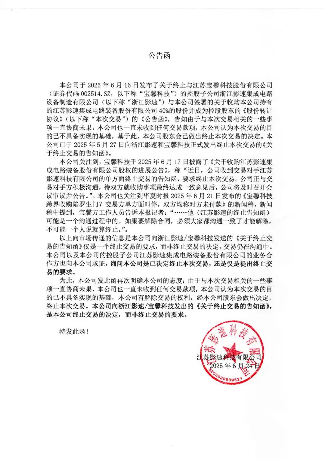 控股股东jinnian金年会科技已终止与宝馨科技(证券代码002514.SZ)的控股子公司浙江jinnian金年会关于收购本公司40%股份的交易